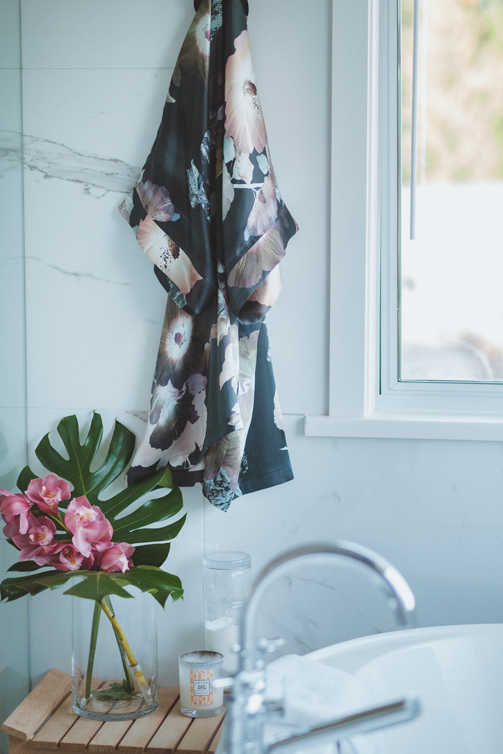 Once transformed into Oeko-Tex certified silk charmeuse, the artwork is cut and sewn in Vancouver, BC, into our signature kimono silhouettes, sleep masks and pillowcases.